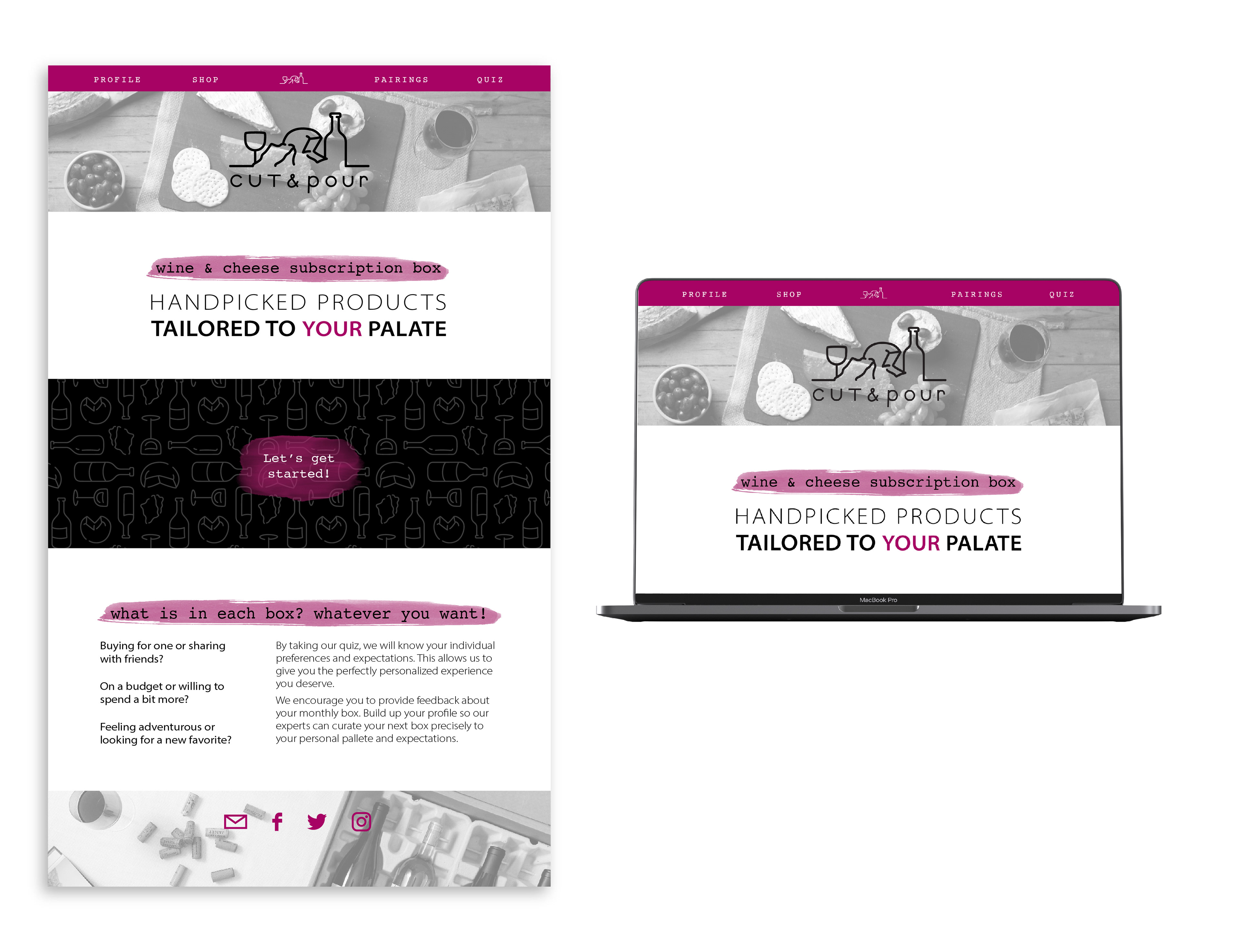 Cut & Pour is a customized subscription box for wine and cheese lovers. This company provides a personalized experience for each customer by tailoring every box to each individual. The process starts with a quiz that will determine the customer’s desired price range, taste preferences, and more. A Cut & Pour specialist hand picks wine and cheese pairings based on the individual's quiz results. Each box contains 2 pairings and a detailed booklet that explains the flavor profiles of each product and why they are paired together. On the Cut & Pour website, users can provide feedback about their experience, reorder their favorite items, or order their next box.